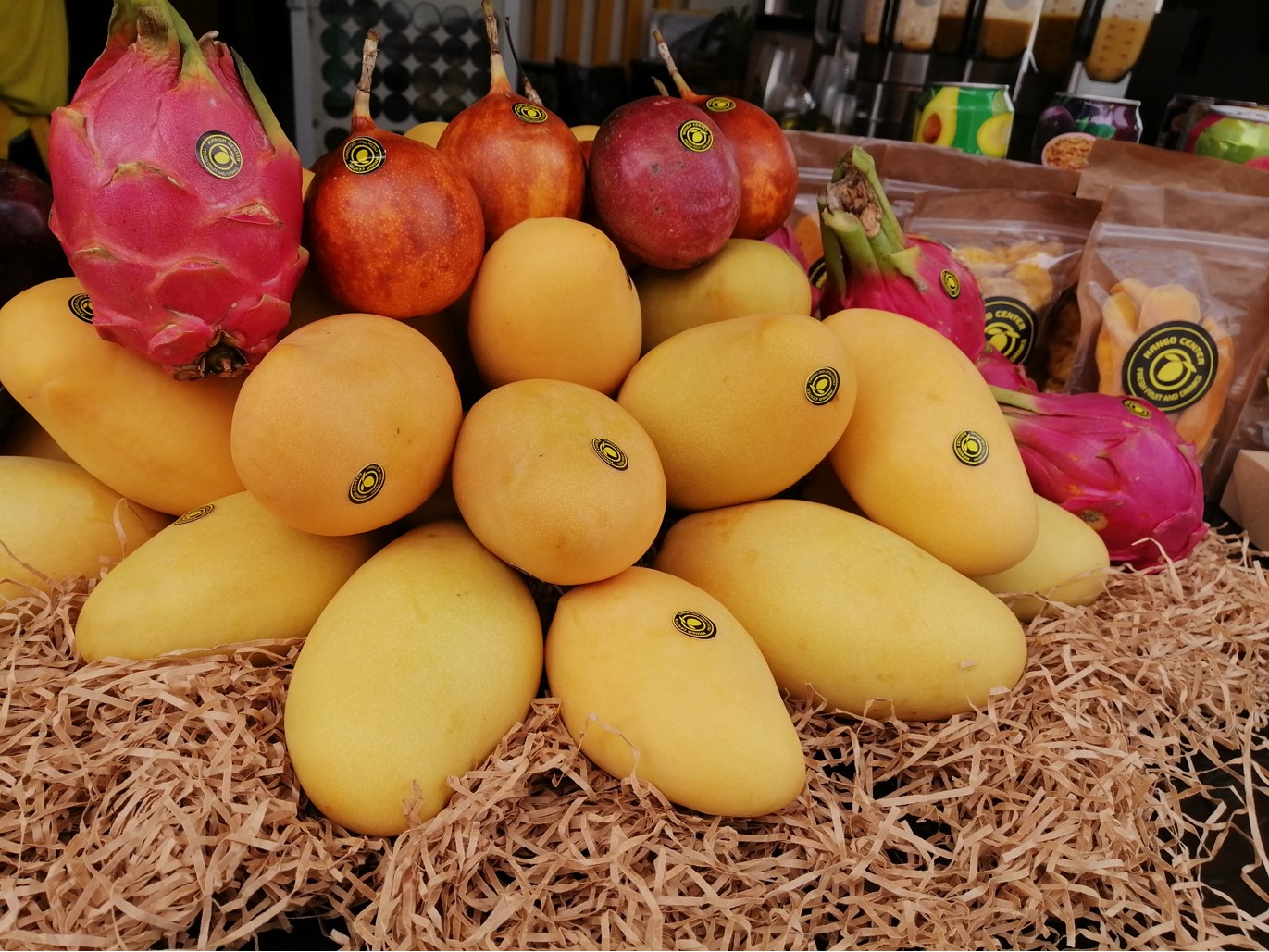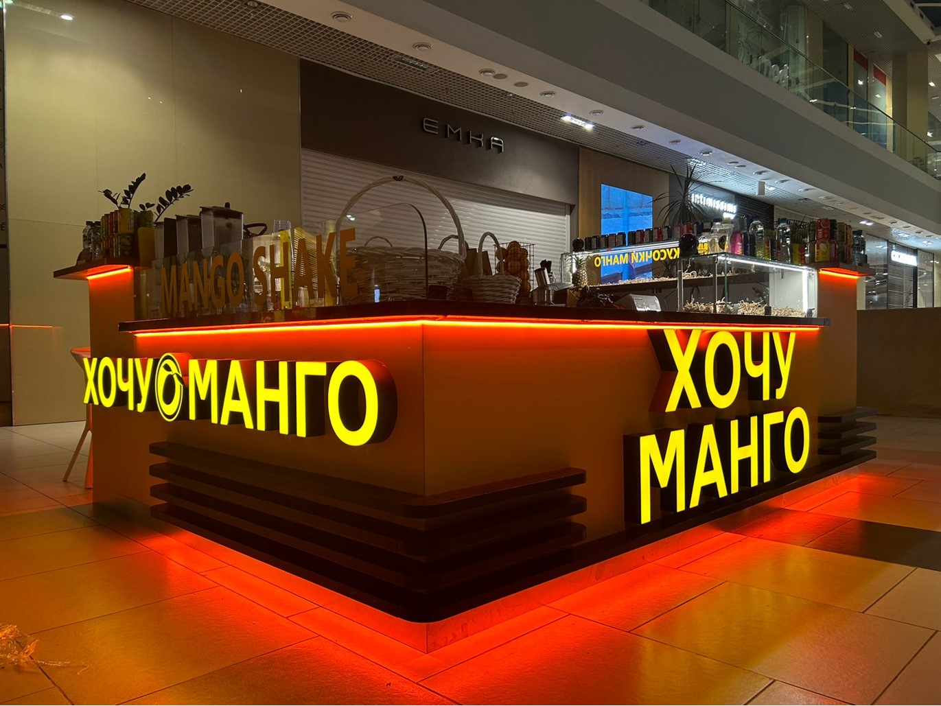 Привлекающая внимание желто-черная вывеска, красивая витрина из свежих экзотических фруктов, улыбчивый и доброжелательный бармен в фирменной одежде, это территория Джус-бара «Хочу Манго».